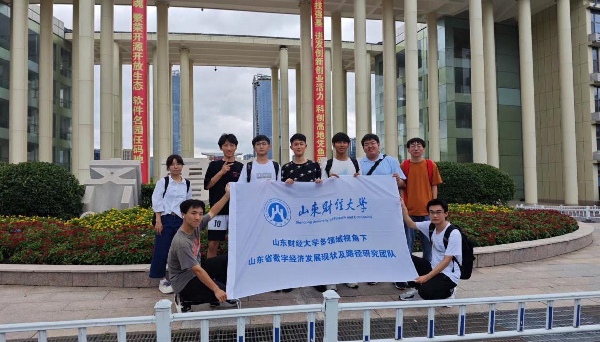 计算机科学与技术专业吕治科为代表的几名同学的呼吁下,成立了由49人组成的多领域视角下山东省数字经济发展现状及路径研究团队。在指导老师韩慧健、李云枝的指导下,团队设立多个分队,分别针对科技智能、快销品、新能源、金融、生物医药等行业,以及以“济南市一网通办”为典型代表的数字治理领域展开了全面而深入的实地调研。