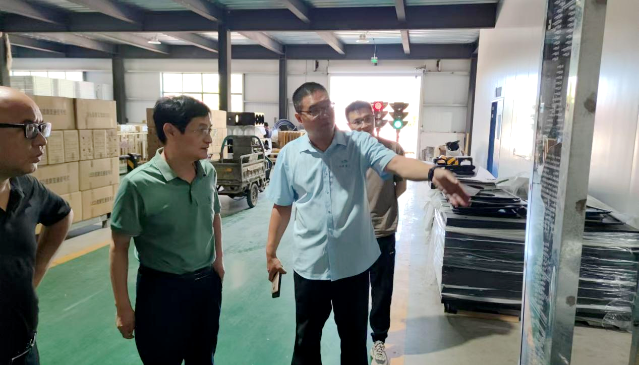在佳泽交通位于泰安宁阳的生产车间,公司总经理邵军、技术部副部长杜焕刚向客人介绍了公司的主要产品和工艺流程,双方就智慧交通设施软件技术升级和创新进行了交流。