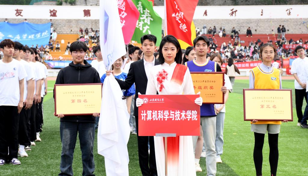 开幕式隆重盛大、热闹非凡,伴随着振奋人心的音乐和彰显现专业特色的入场解说,国旗护卫队、校旗方队、各学院代表队依次入场。彩旗飘扬、口号响亮,学院方队迈着整齐划一的步伐,精神抖擞、朝气勃勃的向主席台走来,他们手持印有奥林匹克格言“更快、更高、更强—更团结”的拼图,铿锵有力呼喊着“青春财大、魅力计科,凌云赛场、超越自我”的口号,展现着学院朝气蓬勃、积极进取的精神风貌。