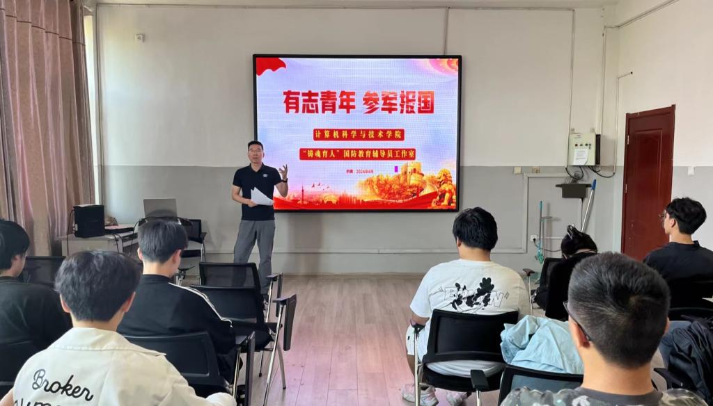 为全面贯彻落实党的二十大精神和习近平总书记新时代强军思想,进一步落实学校2024年征兵工作要求,吸引更多高素质毕业生参军入伍,由学校党委学生工作部(武装部)主办,“铸魂育人”辅导员工作室、计算机科学与技术学院承办的“成长·成才大讲堂系列报告”------“携笔从戎,筑梦国防”征兵政策毕业生专题宣讲会于4月24日在燕山校区成功举办。活动由“铸魂育人”国防教育辅导员工作室主持人、学院学工办主任任楠担任主讲,近百名2024届应届毕业生参加。