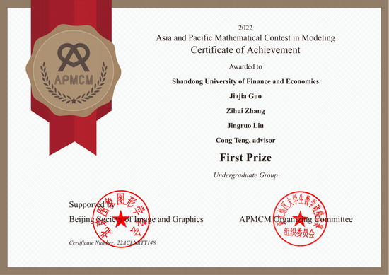 统计与数学学院陈星宇、郭孜轩和计算机科学与技术学院王怡霖组成的团队在统计与数学学院任敏老师指导下荣获本届竞赛最高奖项——"亚太杯"创新奖。