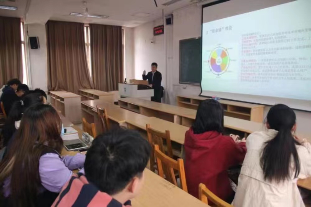 刘思锋从当代大学生要通过树立正确的世界观、人生观、价值观来规划自己人生出发,引导广大青年要把正确的三观内容融入到有意义的职业生涯之路上,给未来插上理想的翅膀,给职场增添现实支撑。随后,他结合舒伯的生涯彩虹理论展开论述,他认为在生命成长、探索、建立、维持、衰退的五个时期要扮演好子女、学生、休闲者、公民、工作者、持家者的六个角色,让生命不仅有长度、宽度,还要有高度、温度。他强调实现人生价值需要学生时代勤学苦读增强本领,工作时代安身立命实现价值,为集体创造价值,为社会做出贡献,保持工作和生活的平衡,获得社会地位和自我满足,只有如此才能经营出美好人生。