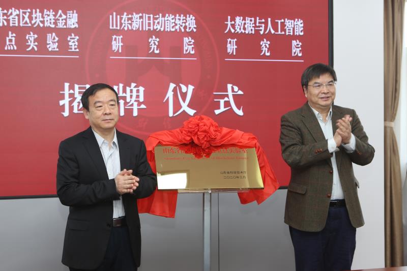 揭牌之前,计算机科学与技术学院院长韩慧健汇报了山东省区块链金融重点实验室建设情况,科研处处长张志元汇报了山东新旧动能转换研究院建设情况,管理科学与工程学院院长刘培德汇报了大数据与人工智能研究院建设情况。