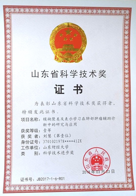 近日,2017年度山东省科学技术奖建议授奖人选和项目公示完毕,由学院刘慧教授主持完成的“模糊聚类及表示学习在肺部肿瘤辅助诊断中的研究与应用”成果获山东省科技进步奖一等奖。这是我校首次获得省级科技类奖励一等奖,标志着我校在科研及其成果转化方面取得了新的突破。