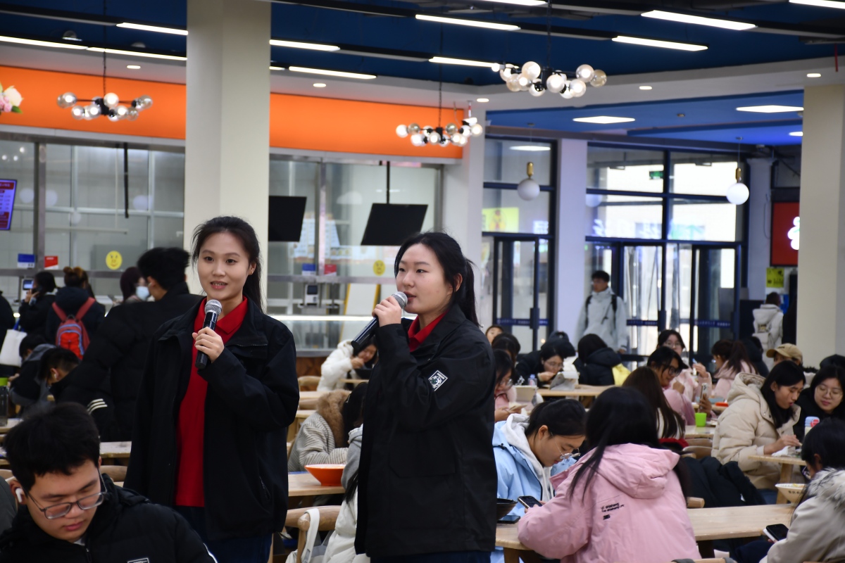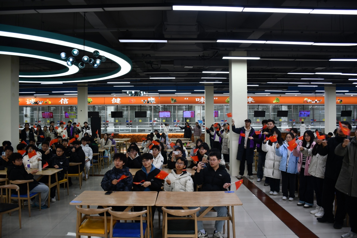 师生手持国旗肃立高歌,原本分散在餐厅各处的参与者有序向中央区域汇聚,迅速形成整齐的合唱方阵。歌声庄重,充满深情,传递出师生对历史的深刻铭记和对和平的共同珍视,充分表达了“勿忘国耻、振兴中华”的坚定信念。活动形式新颖,吸引了大量师生驻足观看,很多同学不由自主地加入合唱队伍,歌声此起彼伏,拍摄灯不停闪烁,现场洋溢起浓厚的爱国主义氛围。