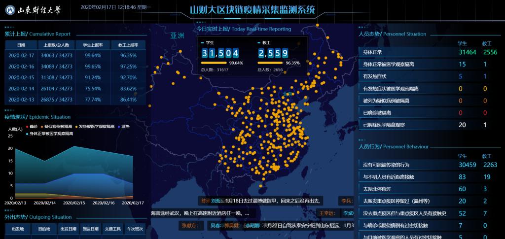 系统采用云计算、区块链技术实现了精准到人、师生员工100%覆盖,并可根据疫情动态即时调整采集数据类型,第一时间掌握疫情态势,实现实时在线监测防控的目标。目前师生填报率已达100%,实现了教育部“全面摸清、准确掌握学生所在地区、健康状况等信息。主动联系每一位学生,随时沟通情况”的要求。系统采用区块链数据自主开发的疫情安全卡,包含了山东健康通行卡的指标信息,能一次提供14天的可视化健康记录,用颜色给出安全、预警、危险等提示,并提供验证和区块链存证证书,解决了师生需要一次隔离14天的时间难题。