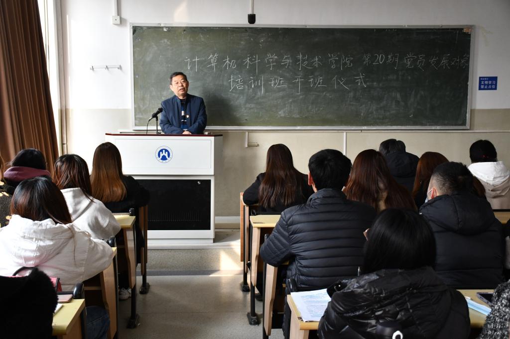 开班仪式上,王有志为大家上了题为《坚定信念,加强修养,强化锻炼,立志成为合格的共产党员》的党课。他讲到青年是祖国的未来,民族的希望,青年兴则国家兴,青年强则国家强。青年一代有理想,有本领,有担当,国家就有前途,民族就有希望。党在不同时期对青年学生寄予厚望,提出要求表述不同,但是核心内容不变。当代青年大学生,处在中华民族伟大复兴的关键点上,就要争做有理想、有本领、有担当的时代青年,理应加强政治追求,成为政治上可靠,思想上成熟,行动上先进的光荣的共产党员。其次,他指出面向未来,走好新时代的长征路,就要坚定理想信念,矢志不渝的拼搏奋斗,心有所信,方能远行。要加强思想修养,就要在理想信念上做一个明白人,在道德品质上做一个高尚的人,在生活里做一个干净人。他着重强调了加强理论学习的必要性和重要性:加强理论学习,有助于提高共产党员的思想理论素质,有助于保持政治上的清醒和坚定,有助于提升思想境界和道德修养,有助于提高为人民服务的本领。加强理论学习是党员立足的根本,作用不可忽视。同时,王有志传达了党中央召开党史学习动员大会上习近平作出的重要讲话精神、山东省召开党史学习动员大会上刘家义书记重要讲话精神以及学校学习党史动员大会的有关会议要点,他要求广大发展对象认真学习“四史”,尤其是党史,要从中汲取营养,武装头脑,指导实践,推动工作。他强调,今年是建党一百周年,发展党员工作时间紧,任务重,但是发展党员的标准不能降低,一个环节也不少,一个步骤也不打折扣,严格标准和程序,确保发展党员的质量。